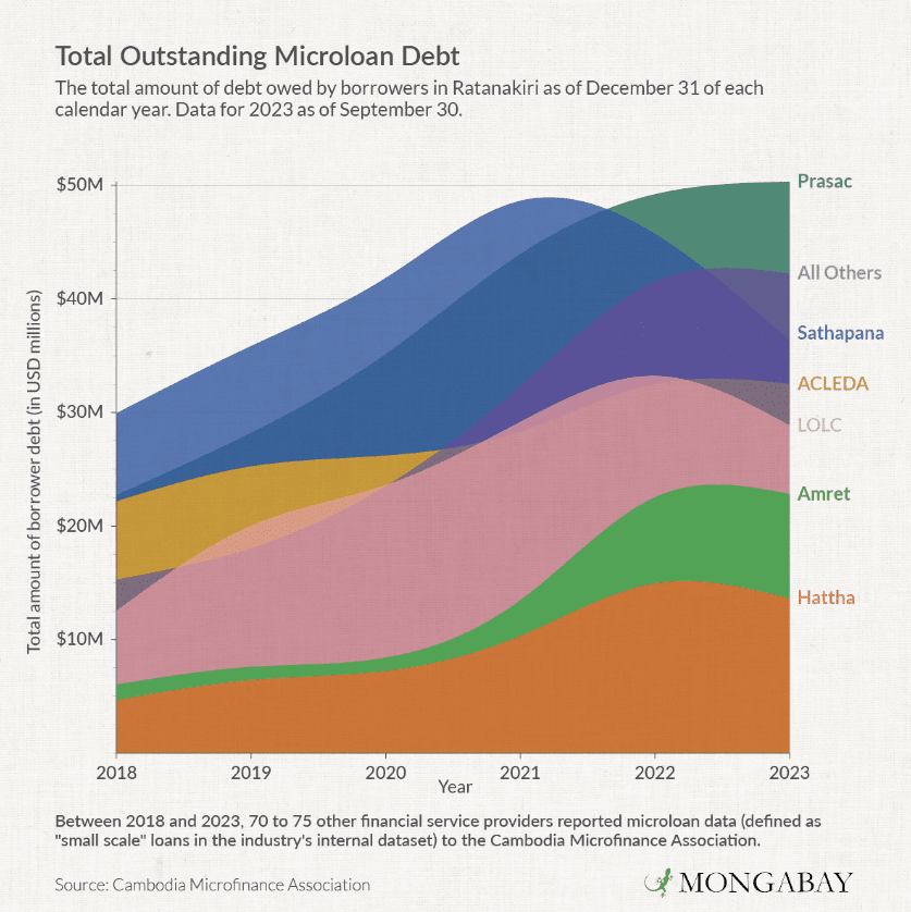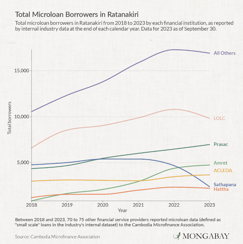 ទិន្នន័យឧស្សាហកម្មផ្ទៃក្នុងដែលចងក្រងដោយ CMA និងទទួលបានដោយ Mongabay បង្ហាញថា នៅចន្លោះឆ្នាំ 2018 ដល់ត្រីមាសទី៣ ឆ្នាំ២០២៣ ចំនួនបំណុលដែលជំពាក់ដោយអ្នកខ្ចីធនាគារនៅខេត្តរតនគិរី បានកើនឡើងពីប្រហែល១១១លានដុល្លារ ដល់ជាង២២៦ លានដុល្លារ ជាមួយនឹងចំនួនអ្នកខ្ចីកើនឡើងពីប្រហែល ៣១ ០០០ដល់ជាង ៤៦ ០០០នាក់ ។