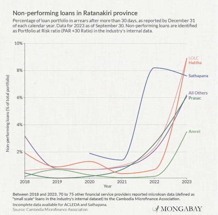 ទិន្នន័យឧស្សាហកម្មផ្ទៃក្នុងដែលទទួលបានដោយ Mongabay បង្ហាញពីអត្រាខ្ពស់នៃ ឥណទានមិនដំណើរការ ដែលវាស់វែងដោយភាគរយនៃផលប័ត្ររបស់គ្រឹះស្ថានមីក្រូហិរញ្ញវត្ថុ ដែលជំពាក់មិនទាន់សងបន្ទាប់ពី៣០ថ្ងៃ ហើយរាយការណ៍ដោយអ្នកផ្តល់ប្រាក់កម្ចីធនាគារនៅទូទាំងខេត្តរតនគិរី។