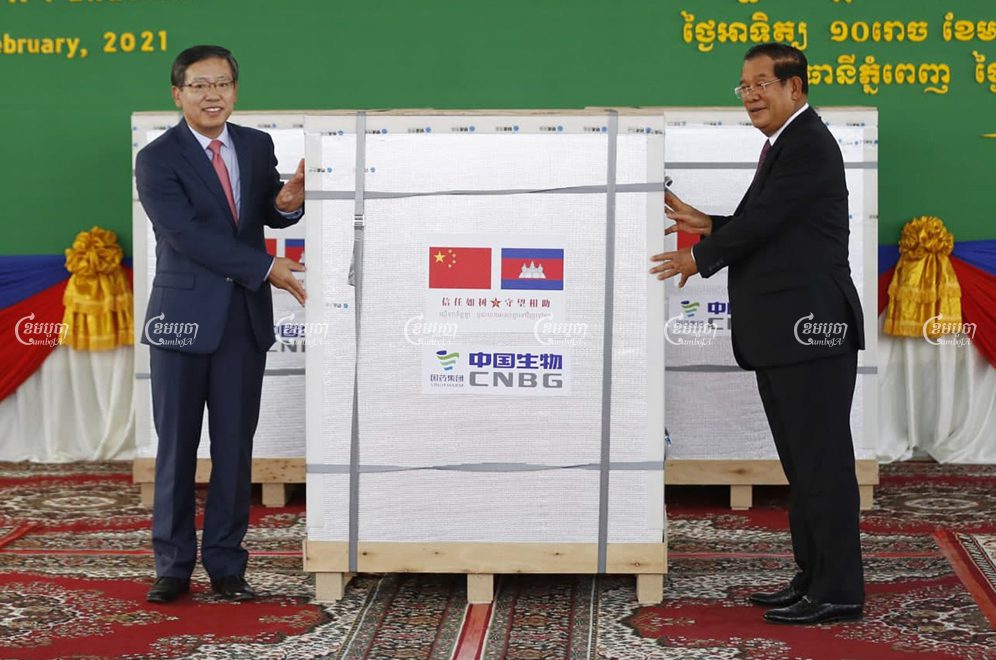 លោកនាយករដ្ឋមន្រ្តីហ៊ុន សែន បានចាត់ឲ្យរដ្ឋមន្រ្តី មេបញ្ជាការយោធា កូនប្រុសបីរូបរបស់លោក និងកូនរបស់មន្រ្តីជាន់ខ្ពស់ឲ្យចាក់វ៉ាក់សាំងប្រឆាំងជំងឺកូវីដ១៩ ជំហានដំបូងនៅកម្ពុជា ខណៈវ៉ាក់សាំងពីក្រុមហ៊ុន ស៊ីណូហ្វាម (Sinopharm) ផ្តល់ដោយប្រទេសចិនបានមកដល់ព្រលានយន្តហោះអន្តរជាតិភ្នំពេញកាលពីថ្ងៃអាទិត្យ ទី០៧ ខែកុម្ភៈ ឆ្នាំ២០២១។