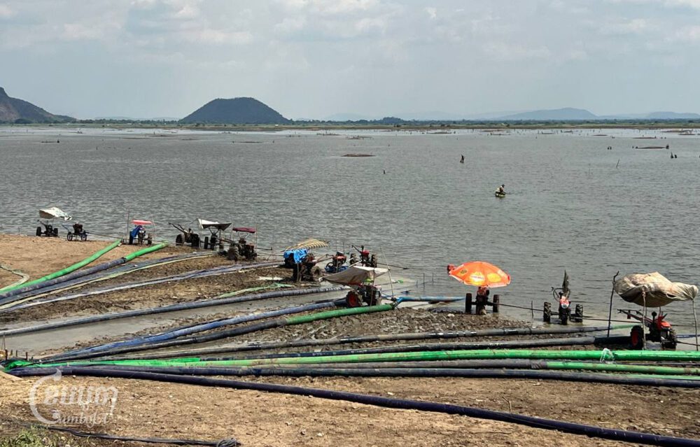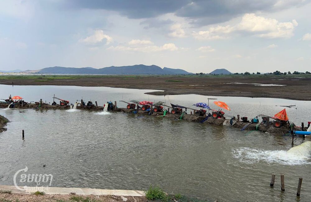 ក្រោមរលកកម្តៅថ្ងៃ៤១អង្សារ កំពុងយកដីល្បាប់បិទទប់ទំនប់កុំឱ្យធ្លាយទឹកដែលបូមចេញពីអាងចូលទៅប្រឡាយកាលពីចុងសប្តាហ៍មុន លោក វ៉ាត ឃីម ជាកសិករម្នាក់ក្នុងចំណោមកសិករច្រើននាក់ទៀតបាន និយាយថា ដោយសារតែឆ្នាំនេះទឹកអាងរីងខ្លាំងស្ទើរដល់បាត មិនអាចបើកទ្វារបង្ហូរទឹកចូលប្រឡាយបាននោះទេ ទើបកសិករនាំគ្នាដាក់ម៉ាស៊ីនគោយន្តតម្រៀបគ្នាបូមបីតង់ទំរាំបានដល់ស្រែនៅប៉ែកខាងក្រោមៗអាង។